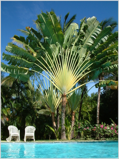 La piscine de la villa avec des paumes de voyageur et les fauteuils à bascule |